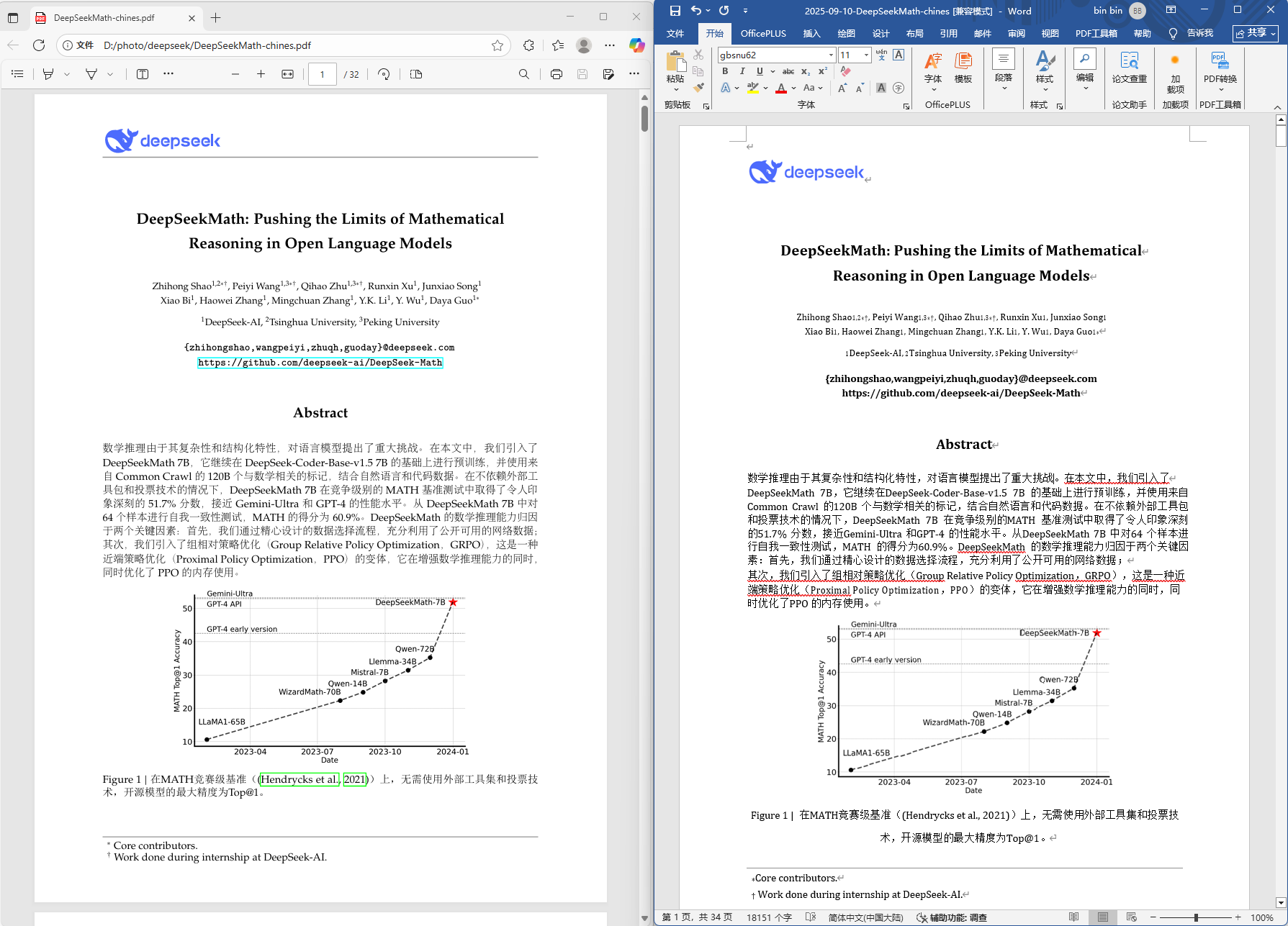 出于工作研究需要,最近下载了一篇DeepSeek的论文《DeepSeekMath: Pushing the Limits of Mathematical Reasoning in Open Language Models》,想引用其中的一些文字和图片,可是PDF格式的文件操作很不方便,就用帮大家PDF超能助手将该论文转为Word格式,没想到效果出奇的好,不论格式还是排版,都和PDF文件保持一致。