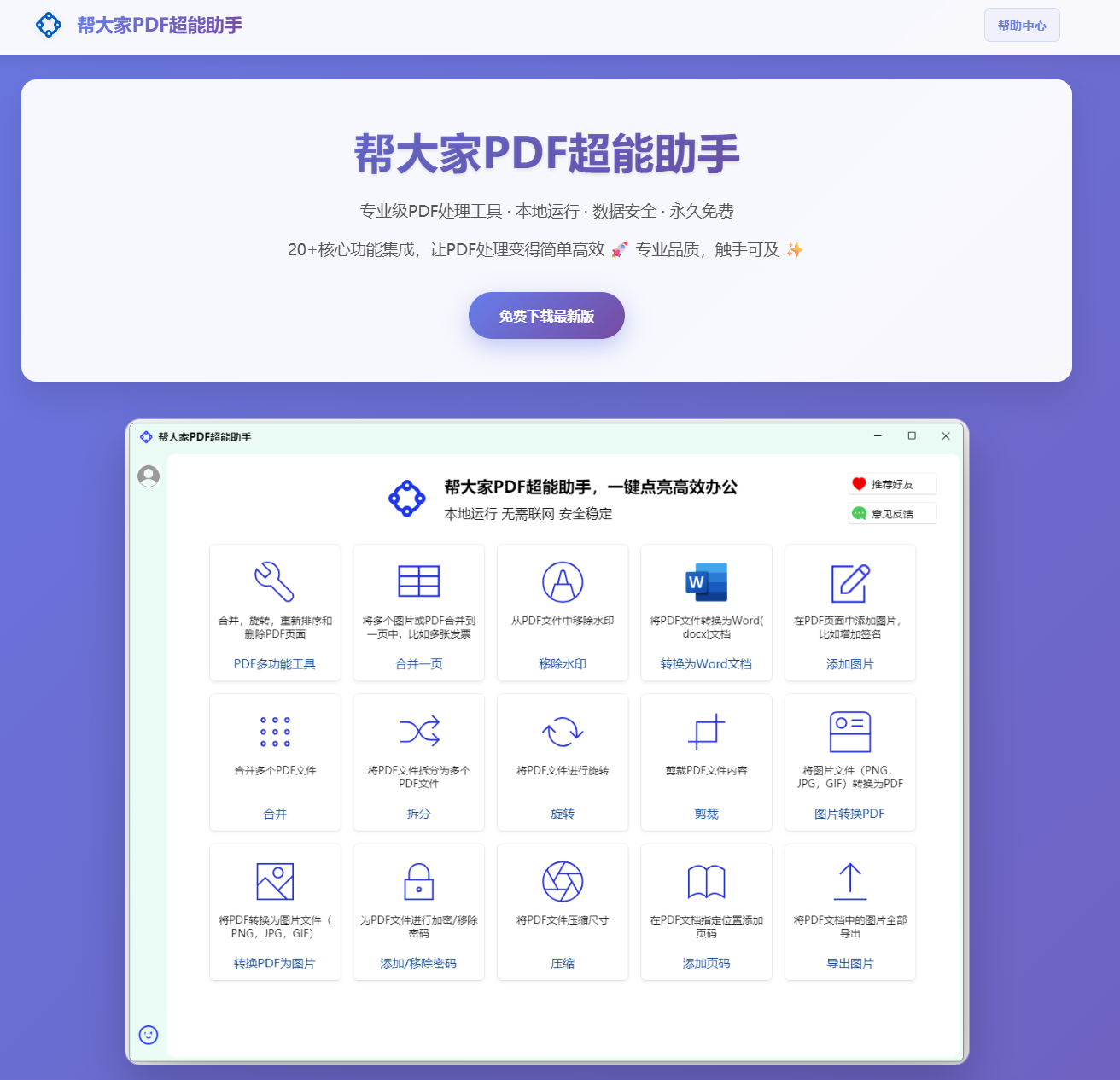 市场上虽有不少在线转换工具,但往往充斥着高昂的订阅费用、隐藏的套路,更别提将敏感文件上传至未知服务器的安全风险。正是在这样的背景下,我发现了一款堪称“宝藏”的软件——帮大家PDF超能助手。它完美地解决了上述所有痛点,其体验之佳,值得我在此郑重分享。